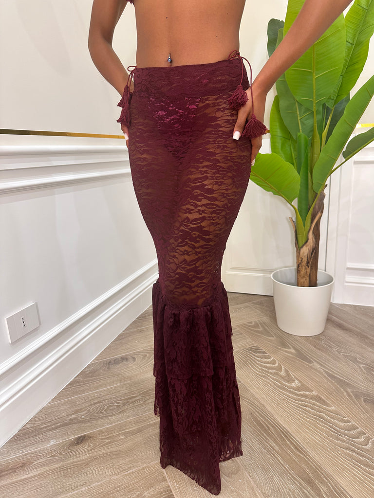 Porta un tocco di fascino e romanticismo ai tuoi outfit con la gonna Fuerteventura in pizzo bordeaux. La gonna è elegante e trasparente, con tre balze che la rendono unica. Perfetta per ogni occasione speciale, ti farà sentire affascinante e irresistibile.