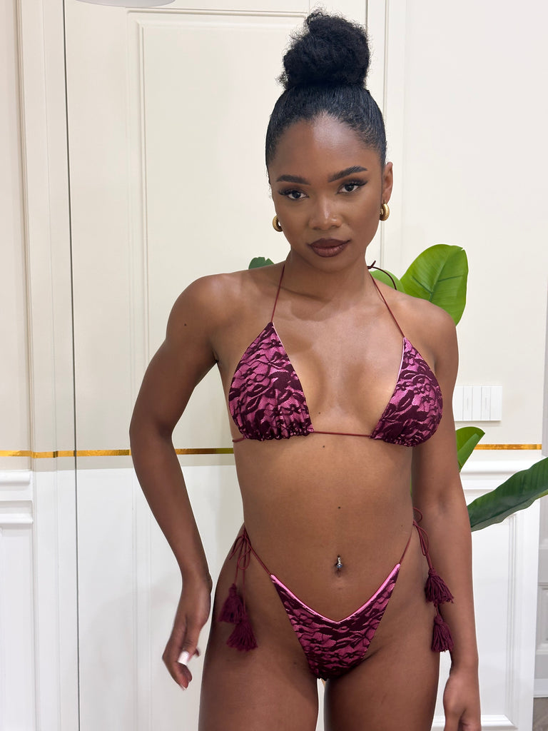 Esibisci il tuo lato stravagante con il bikini Fuerteventura in pizzo. Ispirato ai colori must have, questo bikini unisce tessuti e colori a contrasto per un look unico. Scegli il bordeaux e il fucsia per essere diversa dalle altre in spiaggia!